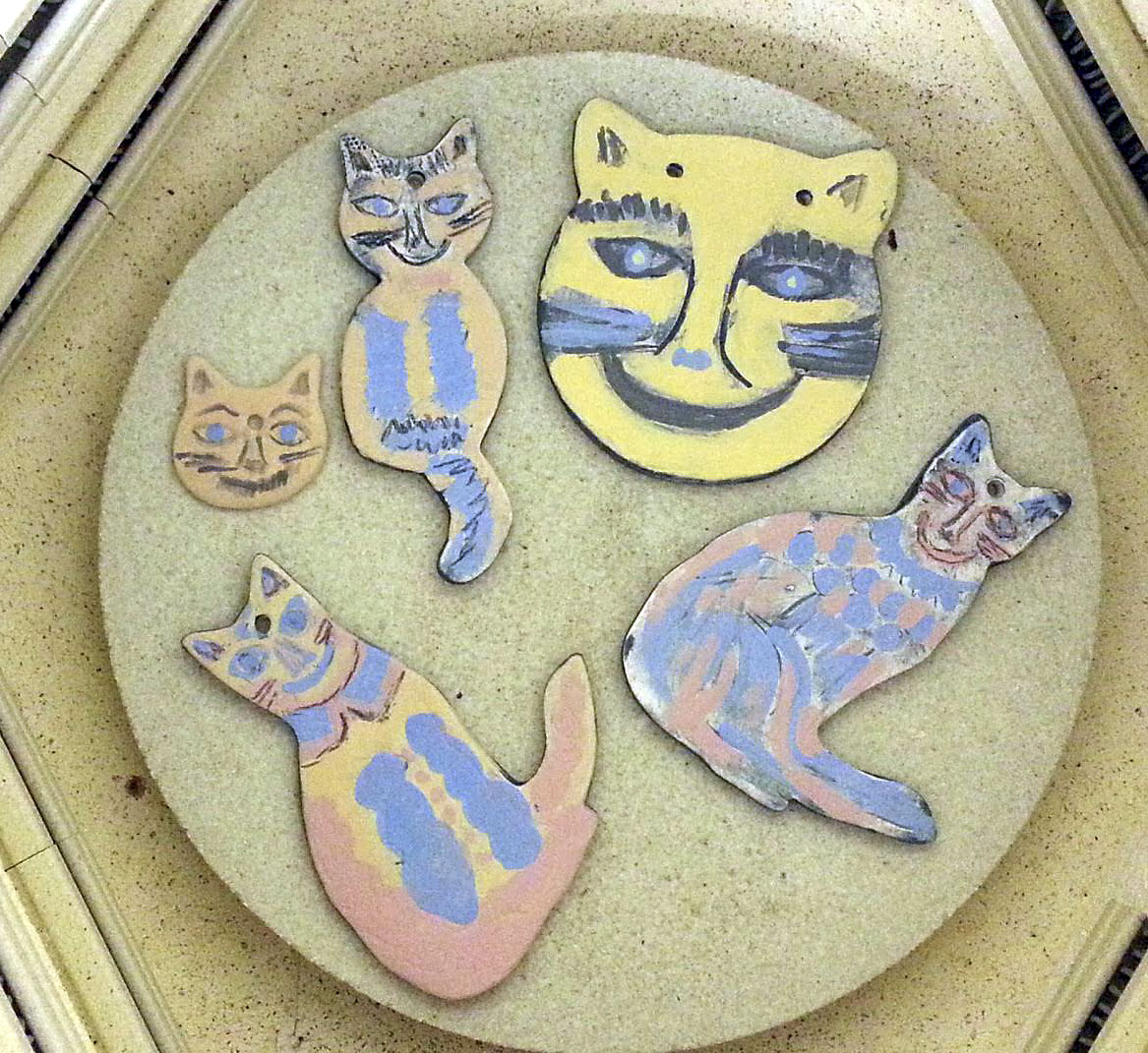 I used two methods to bring my cat decorations to life. For some I silk screened on cat drawings (Mayco silkscreens) bisqued them and then added color
