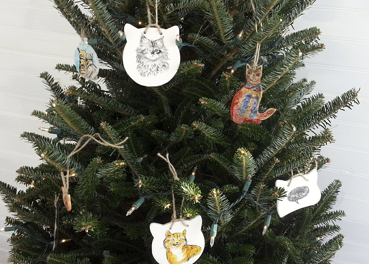 About the time I learned the theme for this month’s Art Elements blog hop: Holiday Creations, I was planning to make a set of kitty cat themed ornaments for a tree for our aging cat. We have a new glassed in front porch and thought it would be a perfect way to decorate it for the Holidays. And for ceramic ornaments, it would be safe from the elements.